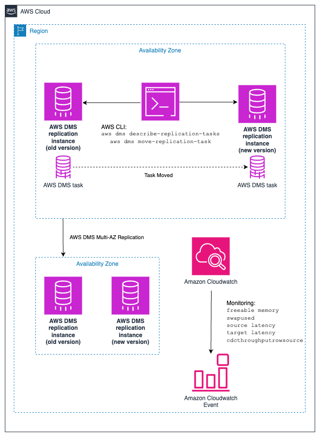In this post, we show how to use the move task option to upgrade your AWS DMS replication instance version using the AWS Command Line Interface (AWS CLI), AWS Management Console, or AWS DMS API. The following diagram illustrates the solution architecture.