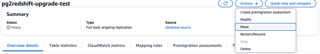 - If the move failed, capture the recovery checkpoint of the AWS DMS task and create a new CDC-only task with the recovery checkpoint.
