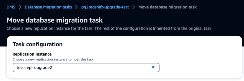 At this point, the upgrade is complete. The replication task resumes in the upgraded AWS DMS replication instance.
