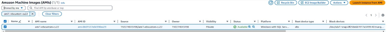 - Wait until AMI ami1-rdscustom-cu22 is in Available state.