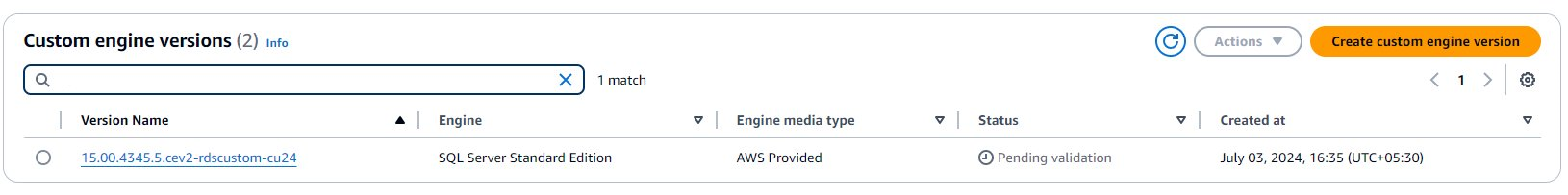 For more details, refer to Working with custom engine versions for RDS Custom for SQL Server.