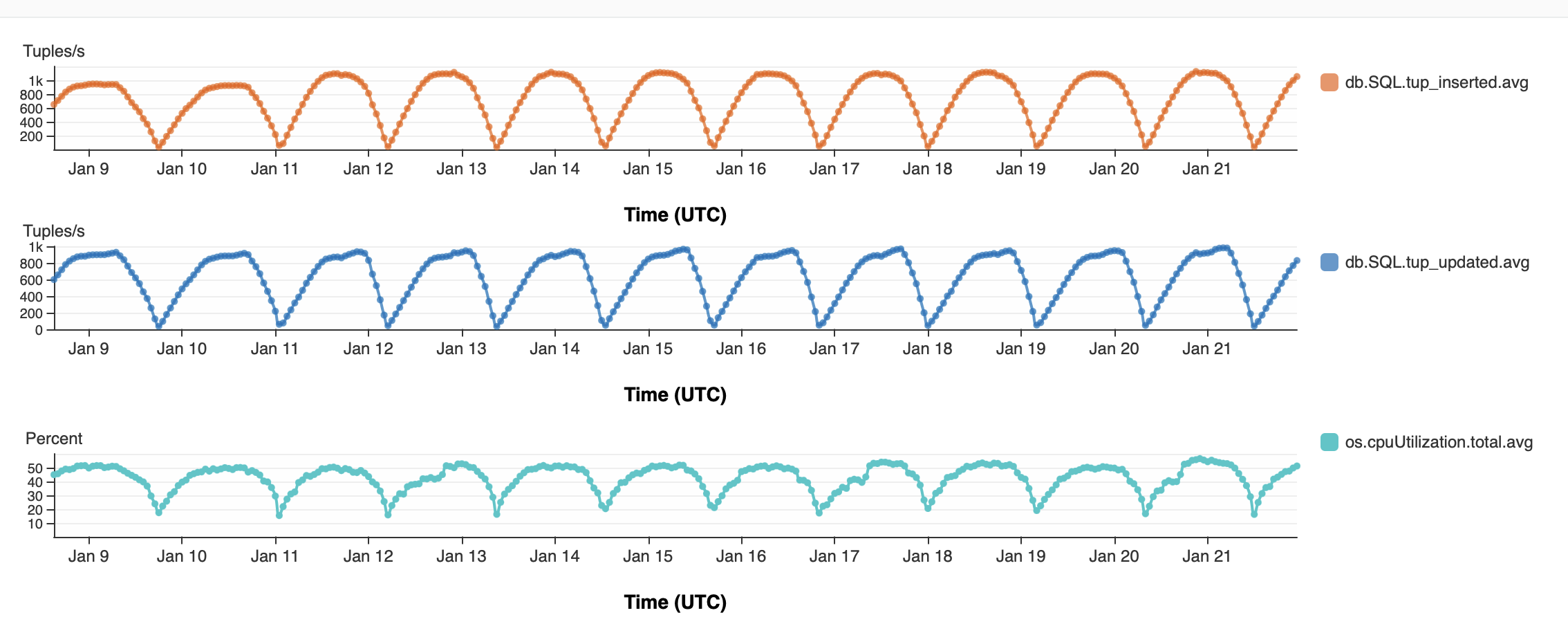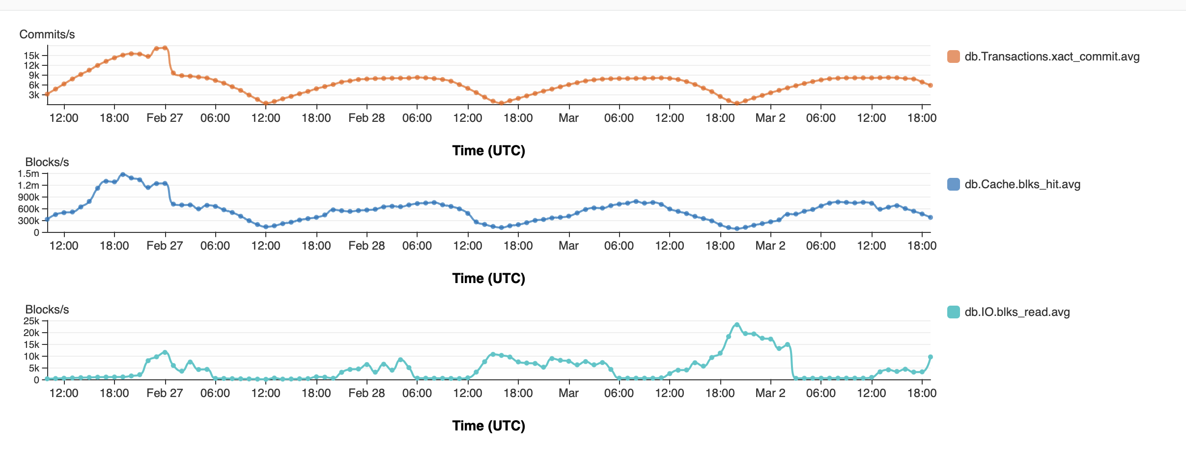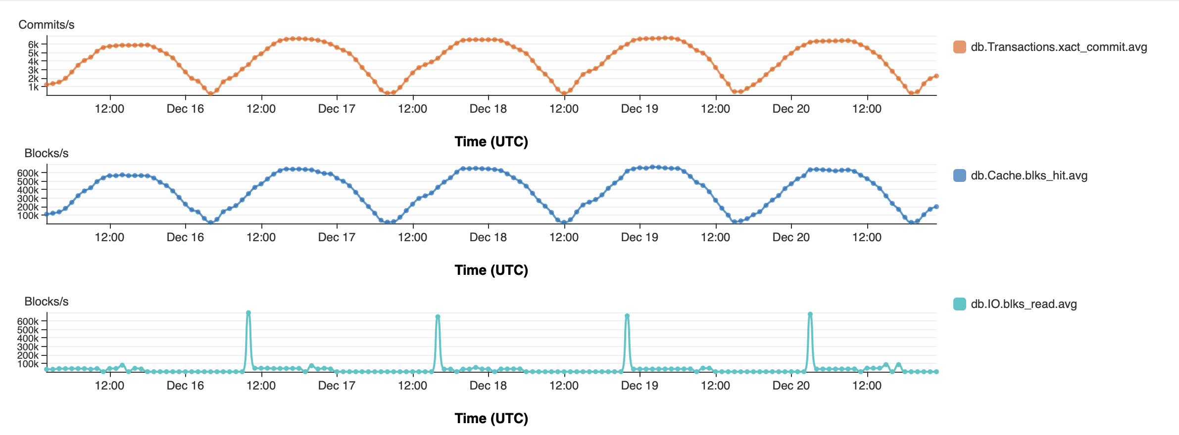 Our simulation shows 600,000 blocks/second spikes of db.IO.blks_read before partitioning with the 33 TB working set, compared with 25,000 blocks/second spikes of db.IO.blks_read with daily partitioning (46 GB working set size). We also observed only 600,000 blocks/second of db.Cache.blks_hit.avg before partitioning and up to 1.5 million db.Cache.blks_hit.avg with daily partitions.