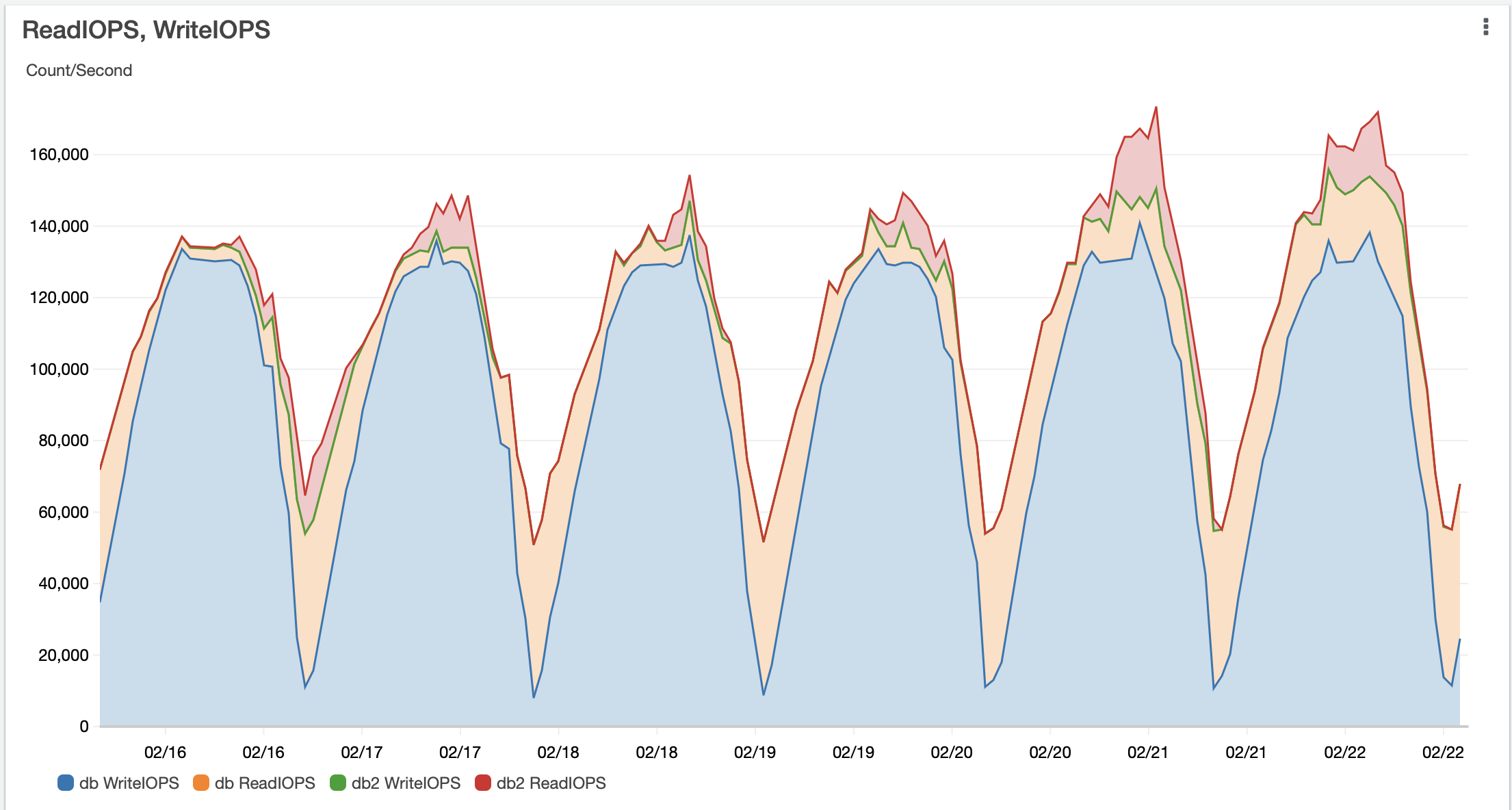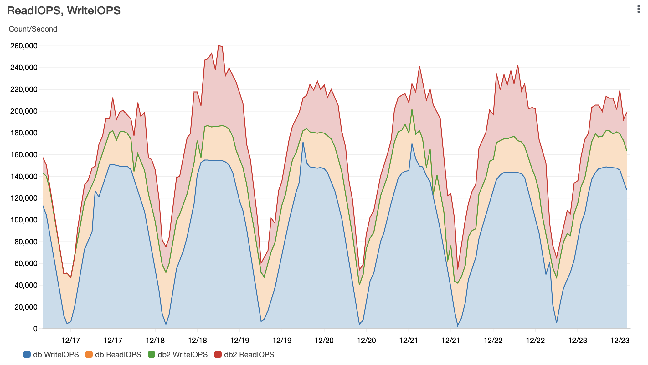 Next, we compare the ReadIOPS that derives from the memory blocks reads optimization in the writer and reader instances. Note the same 140,000 per-second writes (db WriteIOPS), caused by inserts and updates before and after partitioning. The ReadIOPS on the writer (db ReadIOPS) instances is 100, 000 per second, compared to 40,000 per second with daily partitioning. We noticed similar optimization on the reader instance (db2 ReadIOPS).
