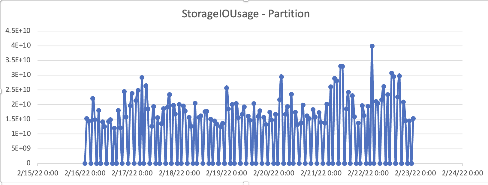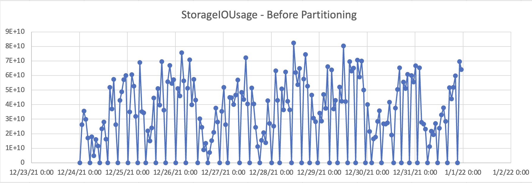 We ran a benchmark with a load simulator that generated 1,000 write (insert and update) and 10,000 read (select) transactions per second, weighing an average of 47 GB per day. We partitioned the database after the total database size was 33 TB of data and observed the I/O usage before and after partitioning.