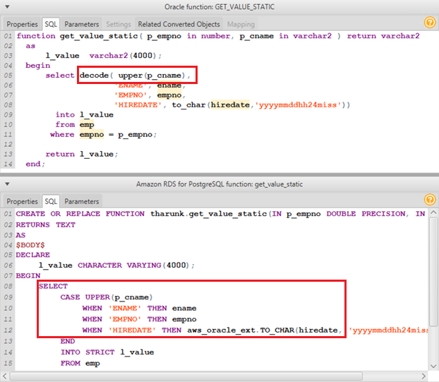 In older versions of Oracle, PL/SQL blocks used the decode statement. This function was eventually replaced by the case statement in Oracle. Enhancements in AWS SCT build 613 can pick up differences like this and convert decode statements into case statements in PostgreSQL. As in earlier builds, you can use the to_char() function conversion from the AWS SCT Oracle extension pack. To learn more about working with extension packs, see our documentation.