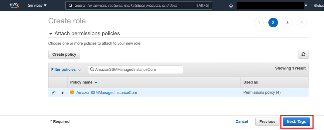 AmazonSSMManagedInstanceCore. - Choose Next: Tags.