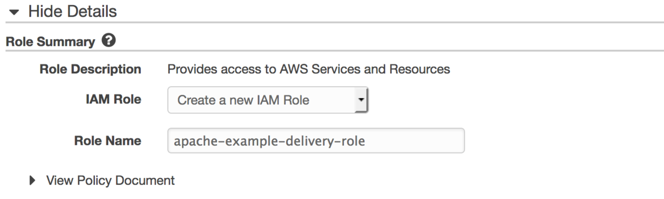 Choose Create a new IAM Role, and name the role our favorite, apache-example. Choose Allow, and you return to the Lambda console.