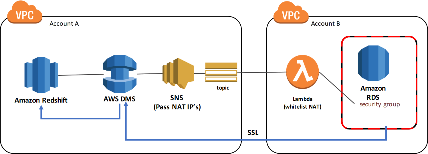 Currently, AWS DMS requires that the Amazon Redshift cluster run in the same account as itself. We enable AWS DMS in account A to communicate with Amazon RDS in account B by whitelisting the public IP address of AWS DMS in the Amazon Aurora inbound security group rules.