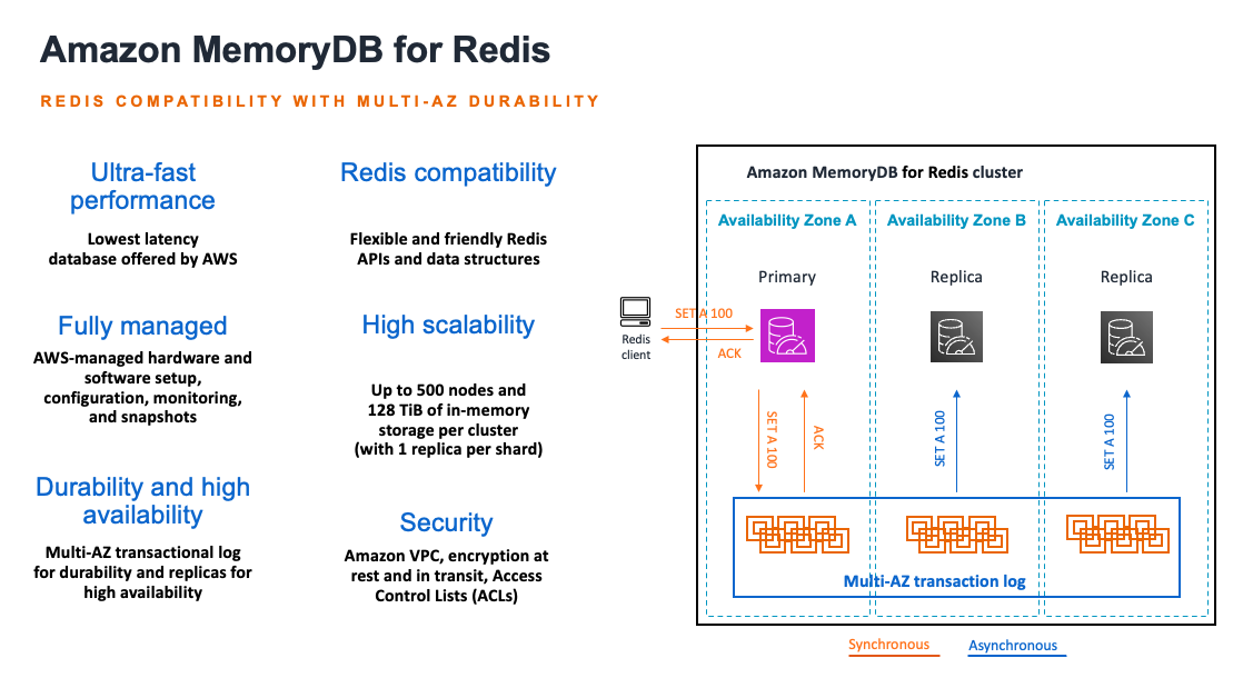 You can use MemoryDB for Redis as the primary database for microservices, serving as a Redis-compatible, durable, in-memory database. MemoryDB makes it straightforward and cost-effective to build applications that require microsecond read and low single-digit millisecond write performance with data durability and high availability. To learn more, refer to Introducing Amazon MemoryDB for Redis – A Redis-Compatible, Durable, In-Memory Database Service and check out a code demo using a microservice in Python that allows you to create, update, delete, and get data for customers from a MemoryDB cluster using a REST API.