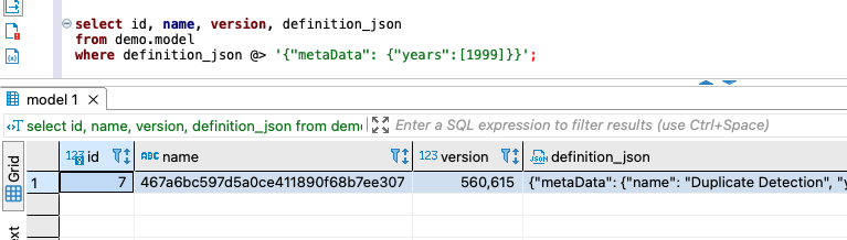 "select id, name, version, definition_json from demo.model where definition_json @> '%s'";