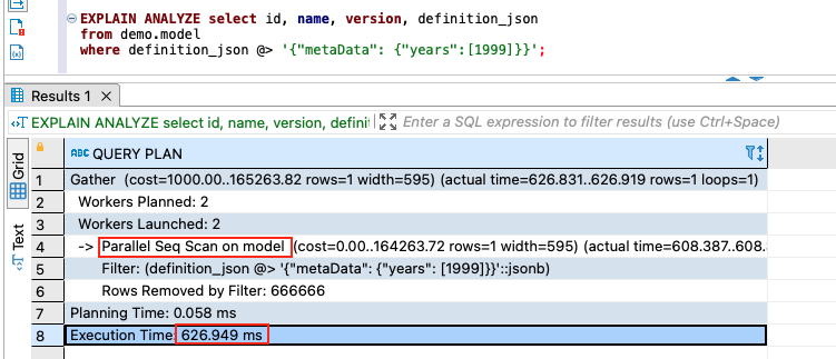 Because there is no index created for the column definition_json, the query plan shows Parallel Seq Scan on model. On our testing platform, the runtime is 626.949 milliseconds.