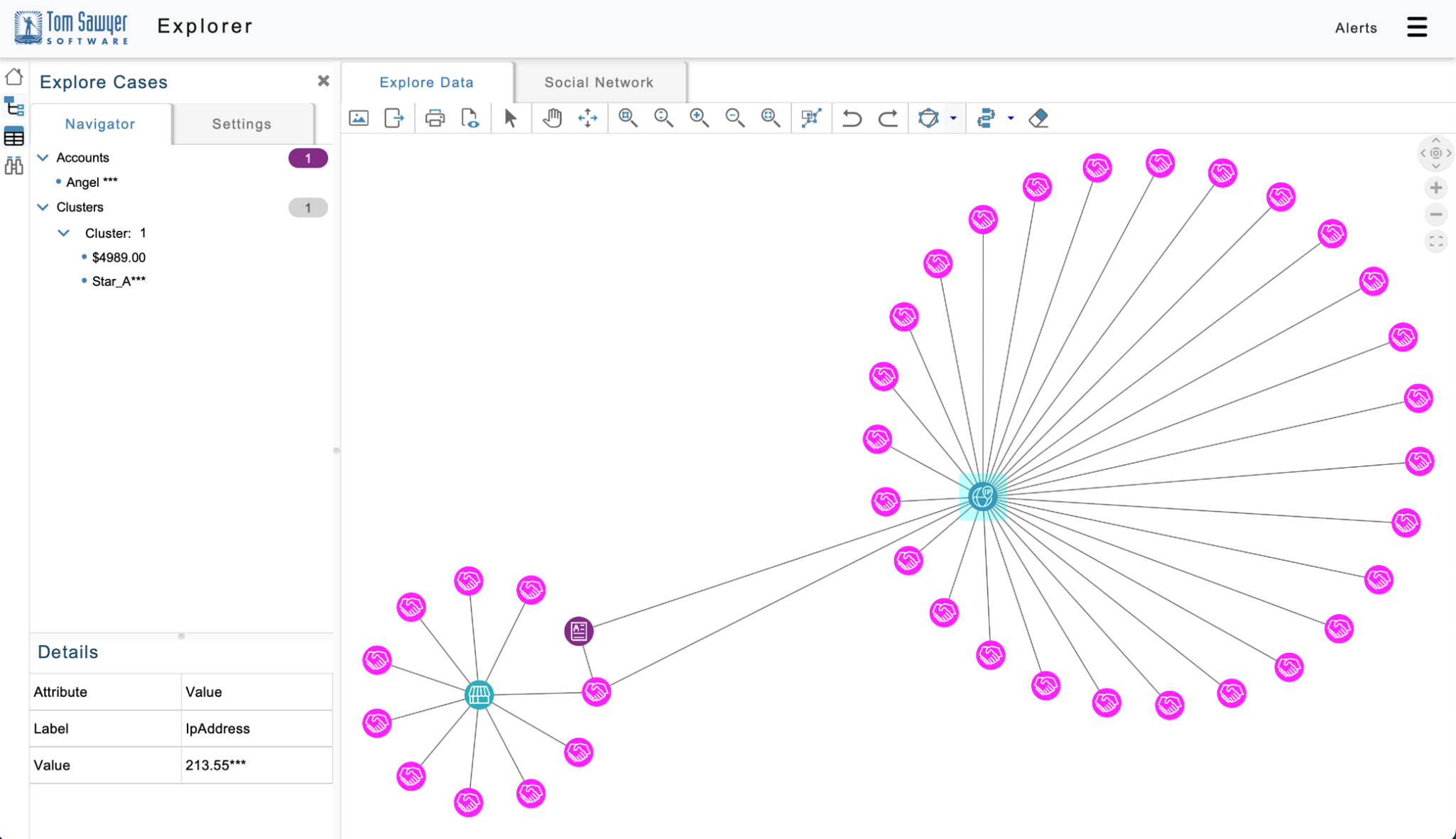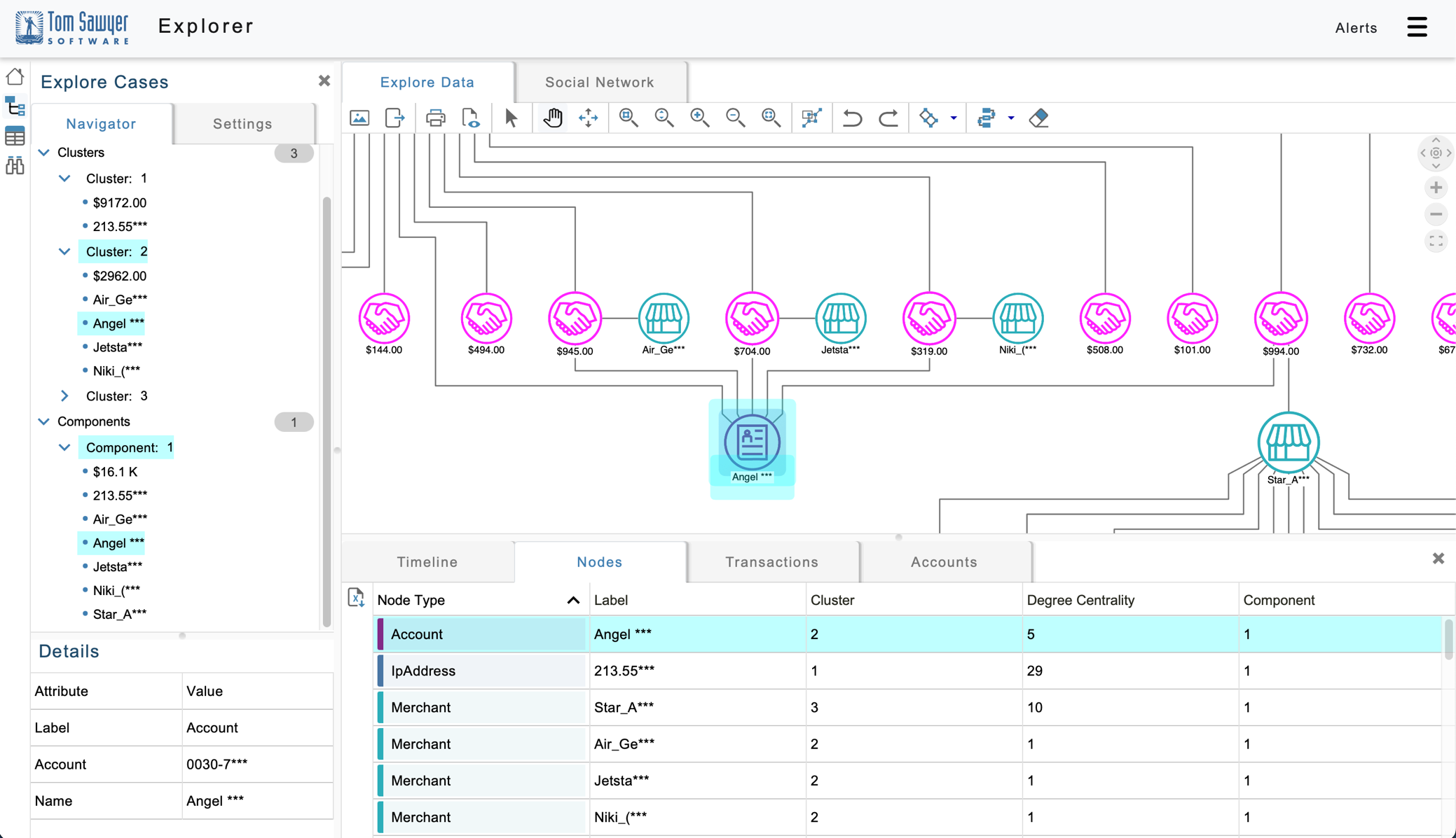 You can explore the $994 transaction by right-clicking on that transaction and loading related elements. The following figure shows the account and IP address associated with that transaction.