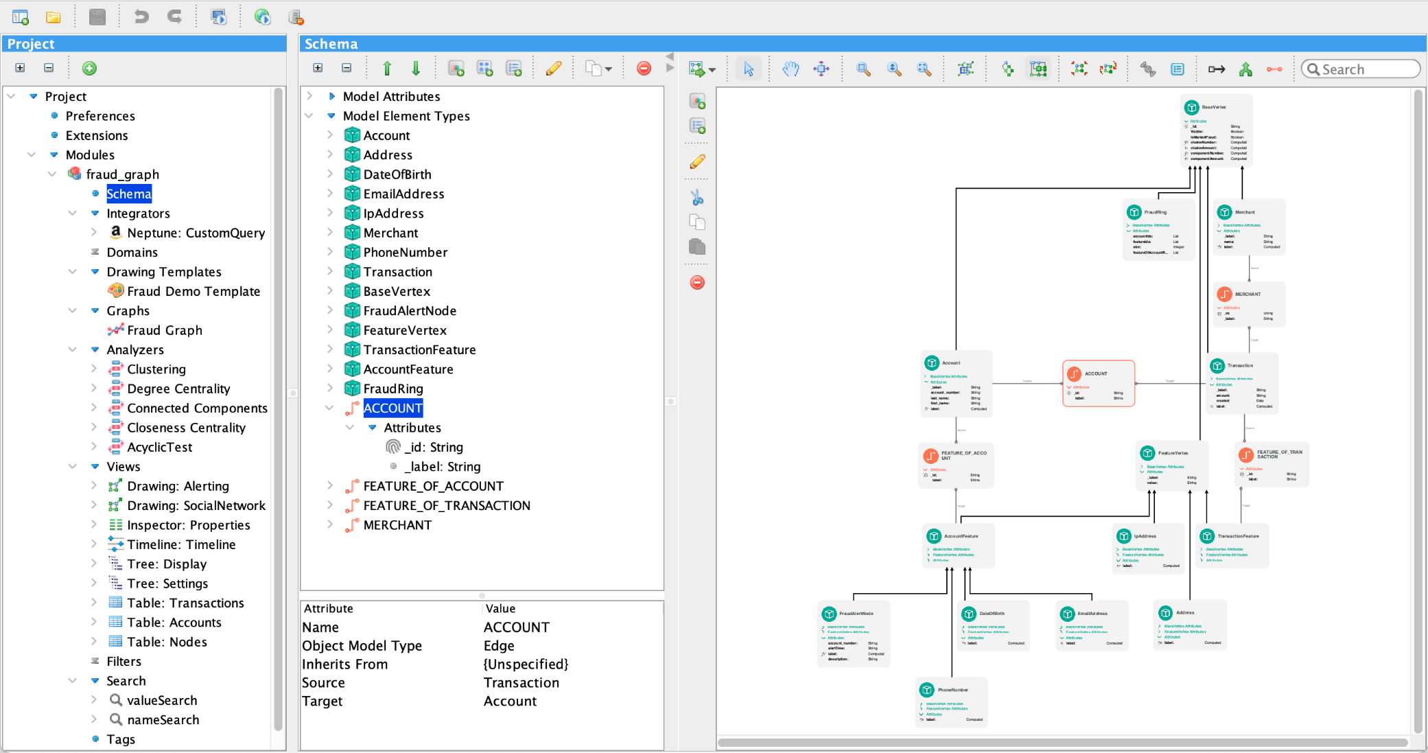 In Perspectives, you interact with the schema through a graph-based visualization. The following figure shows the schema from the example fraud detection application. A property graph represents the schema elements with nodes in green and detailed relationship information in orange. Attributes can be element values or references to attributes in another schema element. A model element can inherit attributes from one or more existing model element types as long as they have the same object model type.