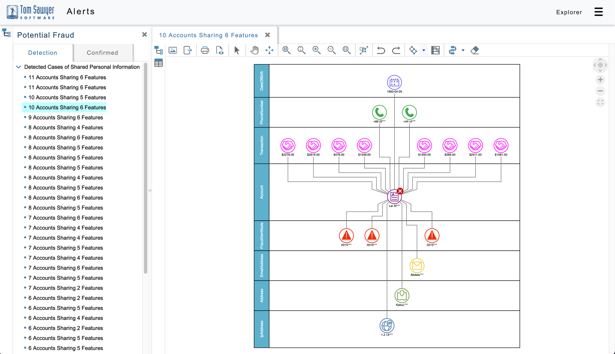 Next, we focus on one of the accounts, Lei Ai****. Adding swimlanes to the following visualization helps us quickly see all the fraud alerts and transactions associated with this account. Swimlanes not only add a layer of categorization information to the visualization, they also give context to the elements within in it. In this case, we can very quickly see the account in question, the recent transactions associated with this account, and the involved IP address.