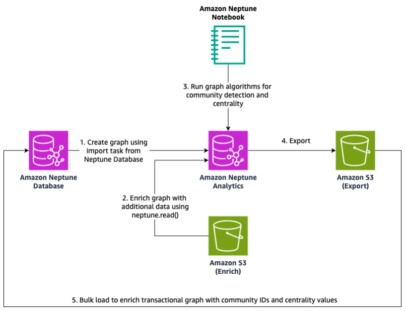 - Alternatively, you can export your graph data to Amazon S3, and re-ingest (using bulk load) into Neptune Database for enrichment of graph transactional data with community IDs and centrality values.