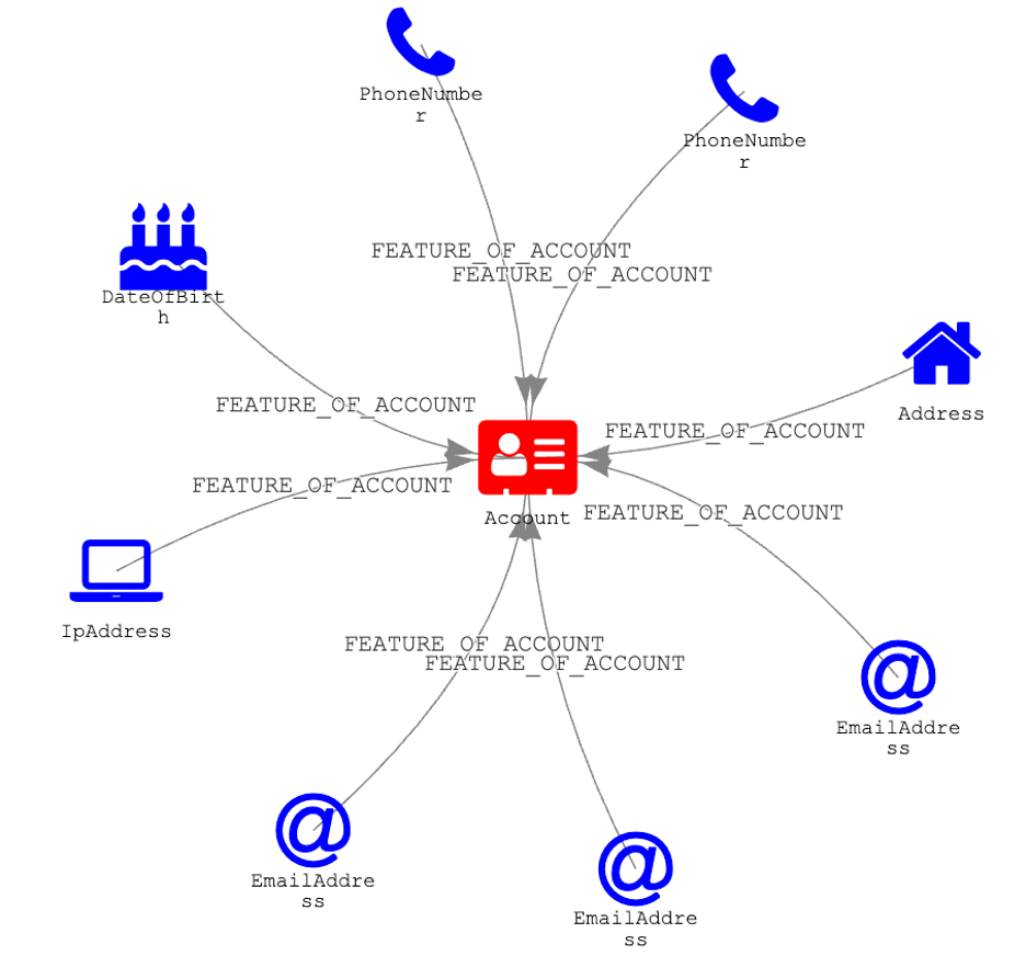 For example, the following diagram illustrates a single account and its associations with the attributes it uses: two phone numbers (represented by the phone icon), three e-mail addresses (represented by the @ icon), one birthday (represented by the cake icon), one IP address (represented by the laptop icon), and one home address (represented by the house icon).