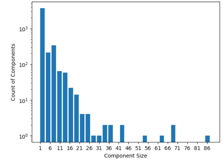 From the distribution, we can see that an overwhelming majority of the components in the graph have less than 40 members. - Let’s investigate what the largest component looks like with the following query: