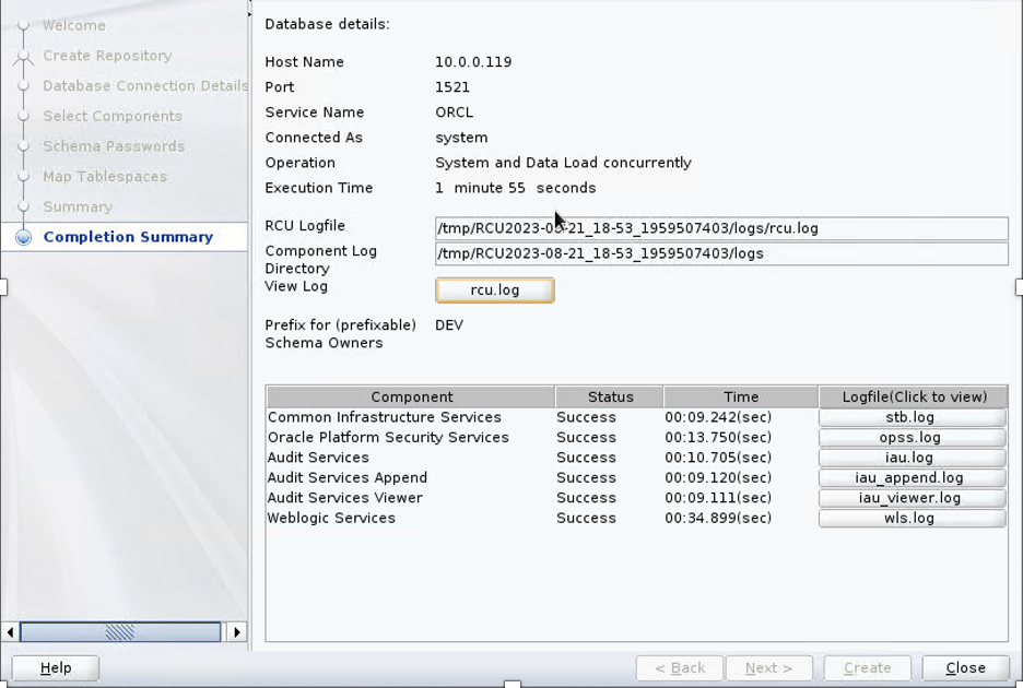 RCU is available with the Oracle Fusion Middleware Infrastructure distribution. After you install Oracle Fusion Middleware Infrastructure and create your Oracle Home, you can start RCU from $ORACLE_HOME/oracle_common/bin. The RCU creation log file is typically stored in the tmp directory as /tmp/RCU<Timestamp>/logs/rcu.log. Complete the following steps to create your database schema: