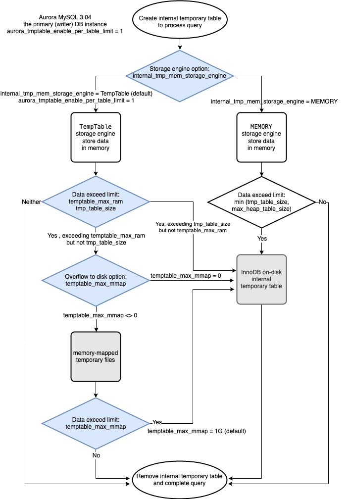 The following diagrams illustrate the configuration parameters related to internal temporary tables in different Aurora MySQL versions.