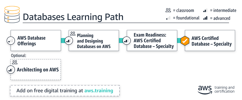 AWS offers resources to help build your database expertise, including the new AWS Databases Learning Path, the three-day Planning and Designing Databases on AWS classroom course, the two-hour Exam Readiness: AWS Certified Database – Specialty digital training course, an in-depth AWS Database Ramp-Up Guide, suggested AWS whitepapers, and product/technical FAQs.