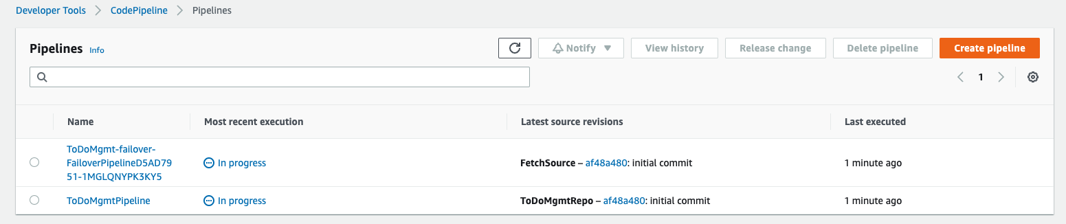 - In AWS Console, navigate to AWS CodePipeline. The solution spins up a “ToDoMgmtPipeline” and “ToDoMgmt-failover<auto-guid>” pipelines