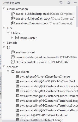 The AWS Explorer window allows you to interact with several AWS services without having to leave your IDE by giving you access to your AWS cloud account.