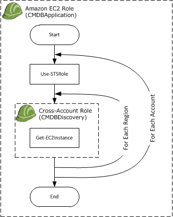 Bob plans to script the process shown in Figure 2. The CMDB script will run on an EC2 instance using the CMDBApplication role. For each account, the script will call Use-STSRole to retrieve a set of temporary credentials for the CMDBDiscovery role. The script will then iterate over each region and call Get-EC2Instance using the CMDBDiscovery credentials to access the appropriate account and list all of its instances.