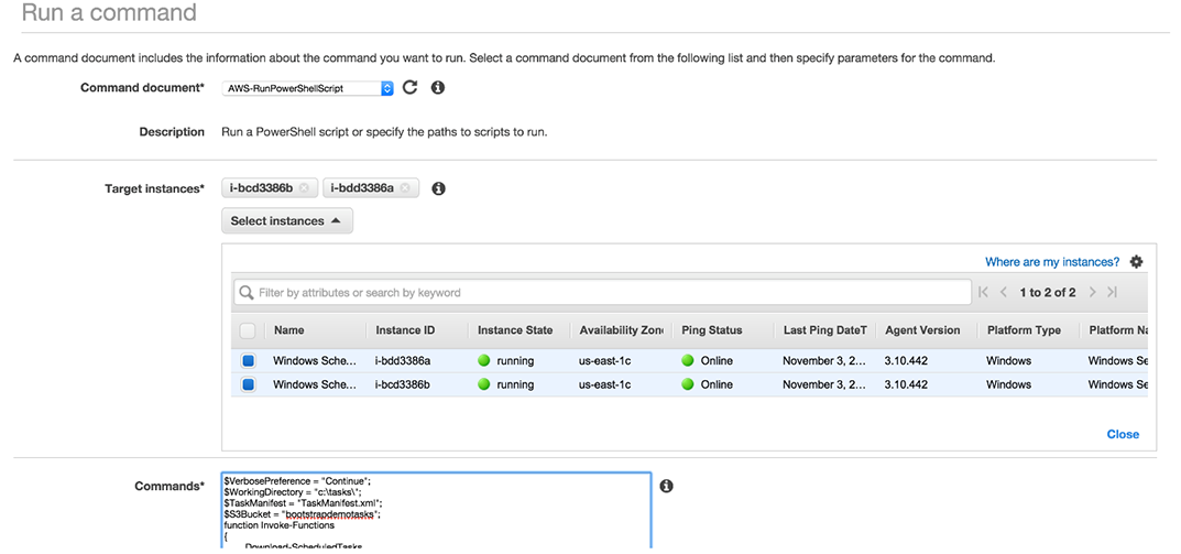 In the previous post, we showed how to use the User data field to install Windows scheduled tasks automatically when Windows EC2 instances are launched. In this post, we will demonstrate how to do the same thing using the new EC2 Run Command, which provides a simple way to remotely execute PowerShell commands against EC2 instances.