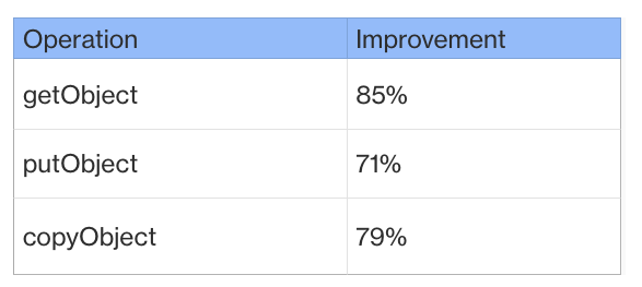 We have conducted performance tests comparing the CRT-based S3 client with the existing S3 async client for getObject, putObject and copyObject operations. From our tests, the CRT based S3 client has better performance for a 256MB object. The following table shows you the improvement percentage for those three operations. We expect customers to observe even greater improvements for objects of larger size.