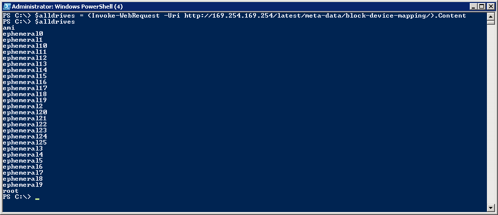 $alldrives = (Invoke-WebRequest -Uri http://169.254.169.254/latest/meta-data/block-device-mapping/).Content