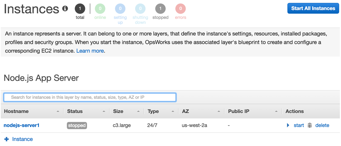 Open the AWS OpsWorks console. Choose the Add Stack button from the dashboard, and then choose Sample Stack. Make sure the Linux OS option is selected, and then choose Create Stack. After the stack has been created, choose Explore the sample stack. Choose the layer named Node.js App Server. You will need the IDs of this sample stack and layer in a later step. You can extract both from the URL of the layer page, which uses this format: