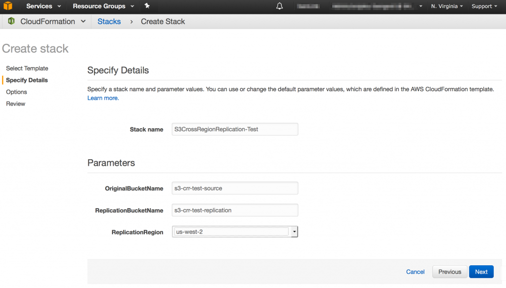 The CloudFormation template provided with this post uses an AWS Lambda-backed custom resource to create an S3 destination bucket in one region and a source S3 bucket in the same region as the CloudFormation endpoint.