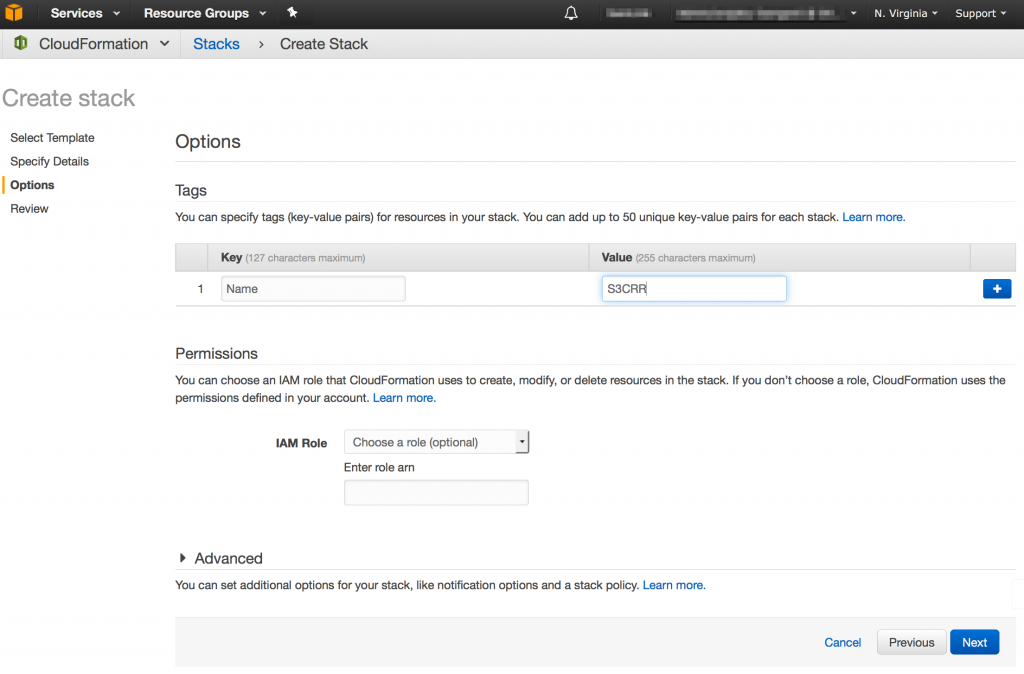 3. On the Options page, you can specify tags for your AWS CloudFormation template, if you like, and then choose Next.