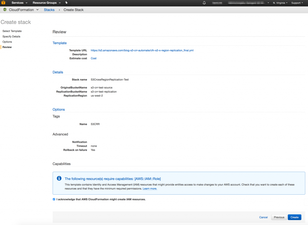 The step-by-step instructions in this section show you how you can automate the creation of an S3 bucket with cross-region replication enabled. After you click the button, the bucket will be created in approximately two minutes.