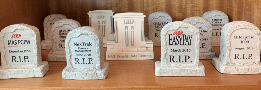 One item that grabs attention are the tombstones we issue to commemorate every time we sunset a legacy application, which has been a key part of our technology modernization. In fact, we’ve been making so much progress that I have a whole shelf above my desk dedicated to these tombstones, so many that it resembles a graveyard of old tech.