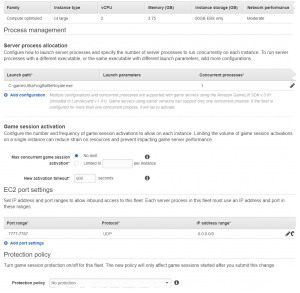 I chose to use c4.large instance types for my fleet as they are included with the AWS free tier, and the demo game is so lightweight they handle the game very well, even with 80 players.
