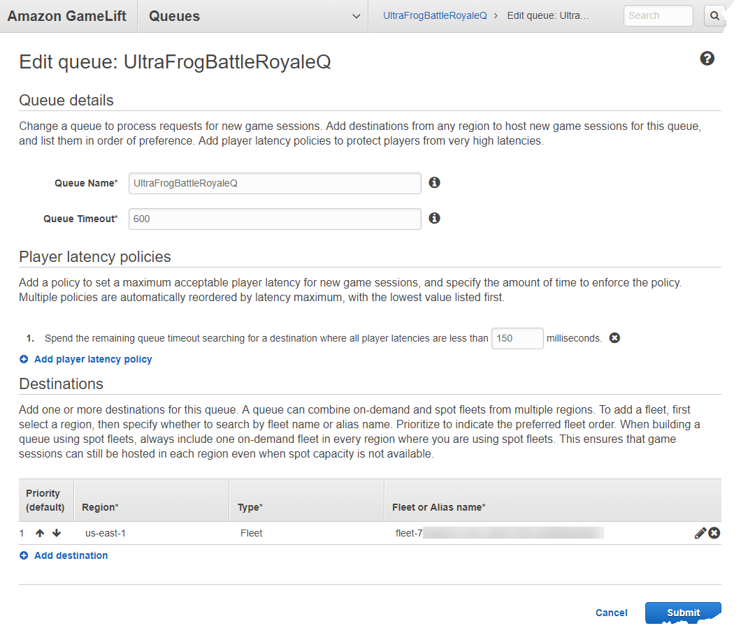 FlexMatch requires the use of a GameLift queue. You can create one now that you’ve got your fleet up and running. For the sake of the demo, don’t worry about implementing auto-scaling or multi-region.