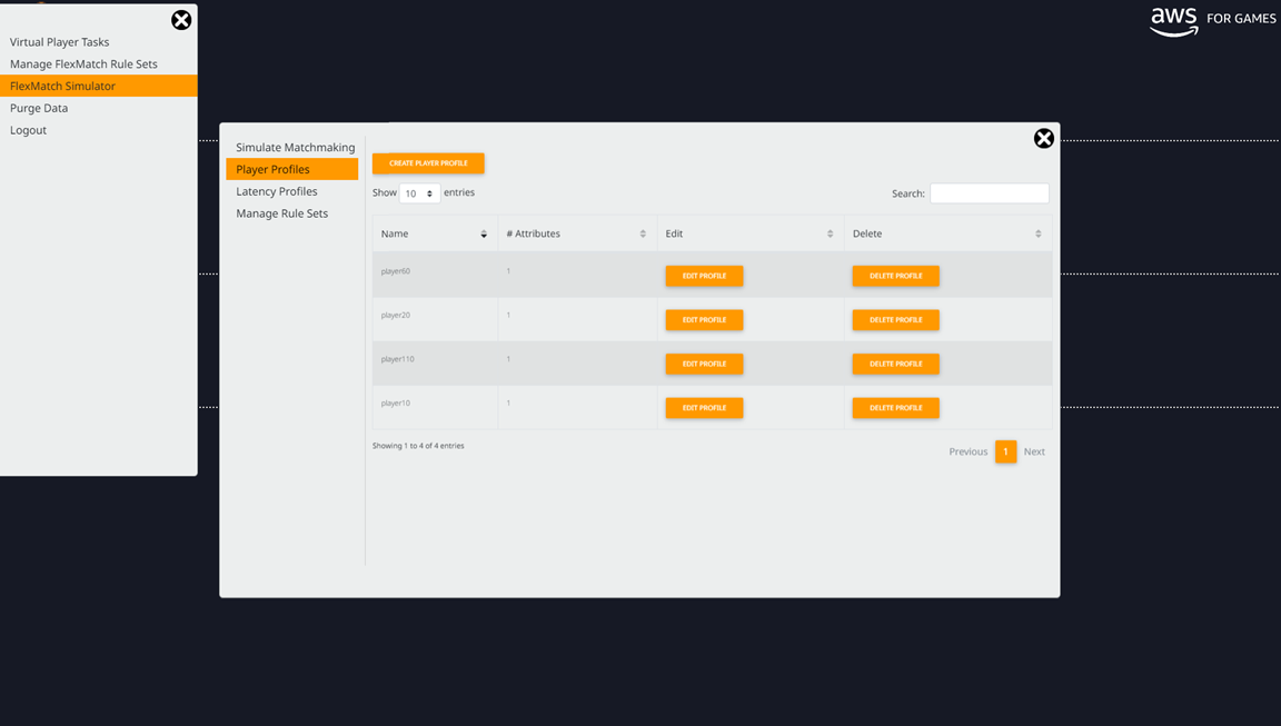 For this blog post, we’ll create some player profiles and add an attribute with an attribute name of “skill,” an attribute type of “Number” with Value Type “Value.” Make the skill values within 10, 50, and 100 of each other. For ease of reading matchmaking results, we’ll give the player profiles names that show what their “skill” attribute is (such as, player10, player20, player100, etc.). Later, we’ll use the FlexMatch Simulator to simulate matchmaking with these players.