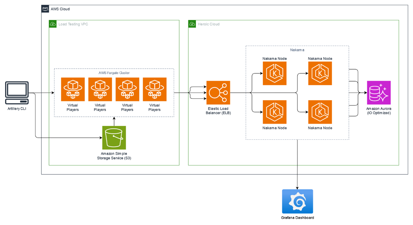 By leveraging highly scalable services like Fargate, Aurora, and EKS, Heroic Labs and Code Wizards pushed the limits of Nakama’s performance and demonstrated its suitability for even the largest-scale games. By using serverless and managed services, there was no overhead of managing underlying server instances, and only the resources required for the load test needed to be provisioned.