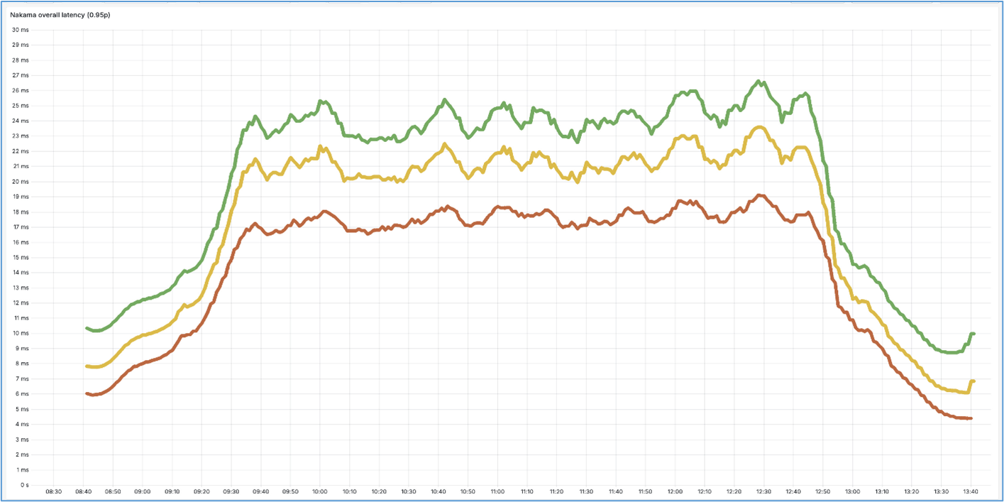 In each of the scenarios, the load testing environment scaled to over two million virtual players for several hours, with Nakama on Heroic Cloud successfully handling the load while operating within normal tolerances.