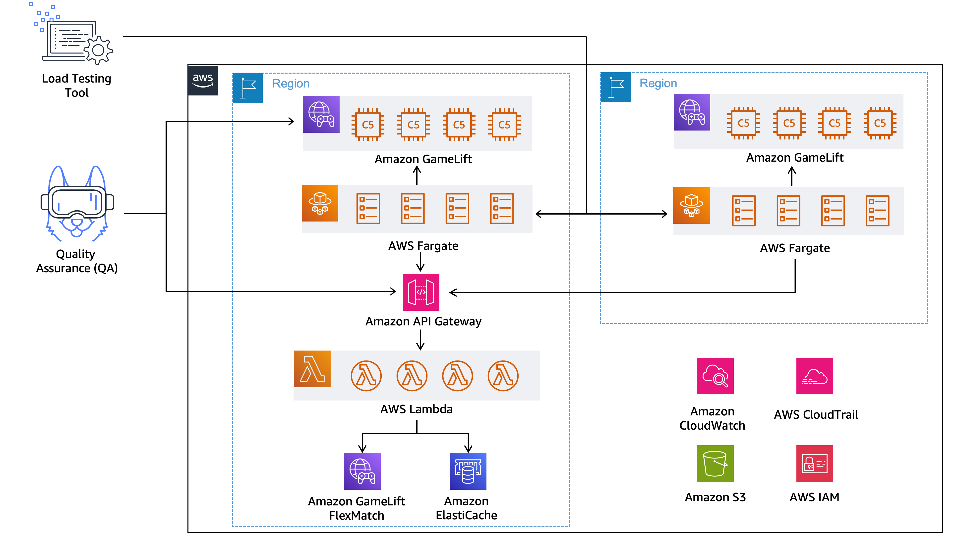 Amazon API Gateway was used to present an API for game clients to request login, matchmaking, and game session action, as well as to accept user data updates and gameplay data relevant for downstream analytics.