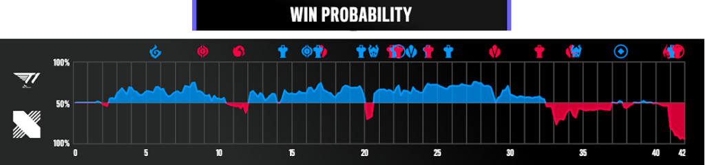 This is what the Win Probability graph looked like during the Worlds 2022 grand final. Both T1 and DRX battled back and forth until the end.