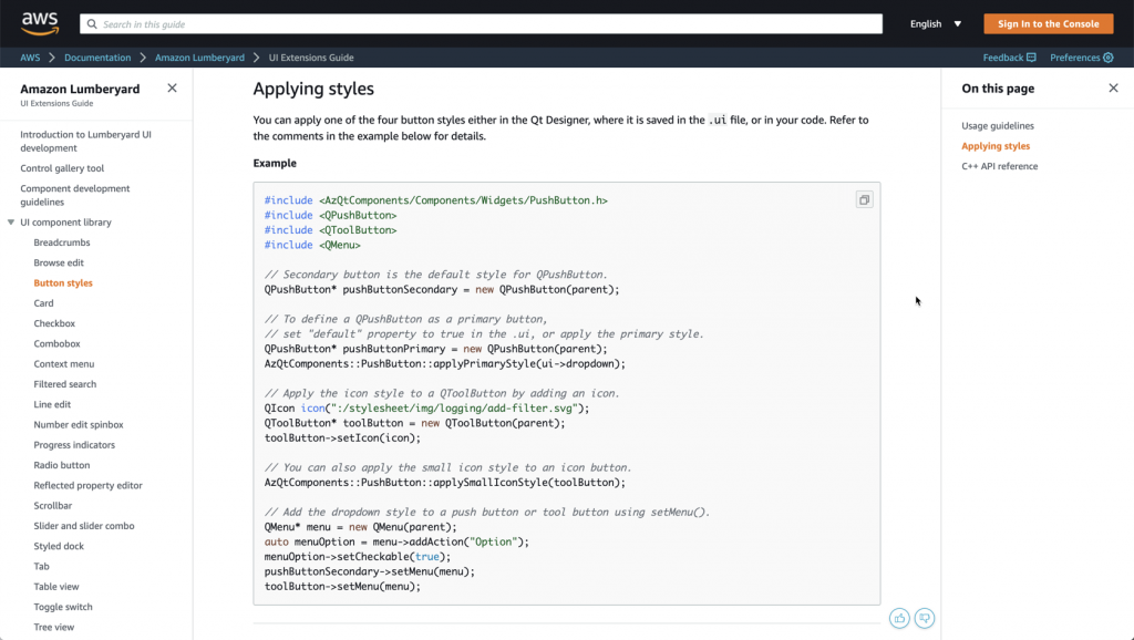 We built the Lumberyard UI Dev Library, which provides developers with access to the same UI components used throughout Lumberyard. Using this library, UI developers can build their own tools and extensions for Lumberyard, while maintaining a coherent and standardized UI experience. This custom library provides new and extended widgets, and includes a set of styles and user interaction patterns that are applied on top of the Qt framework – the C++ library that Lumberyard relies on for its UI. The library can be extended to support your own customizations and modifications. Check it out: https://docs.aws.amazon.com/lumberyard/latest/ui/ui-dev-intro.html