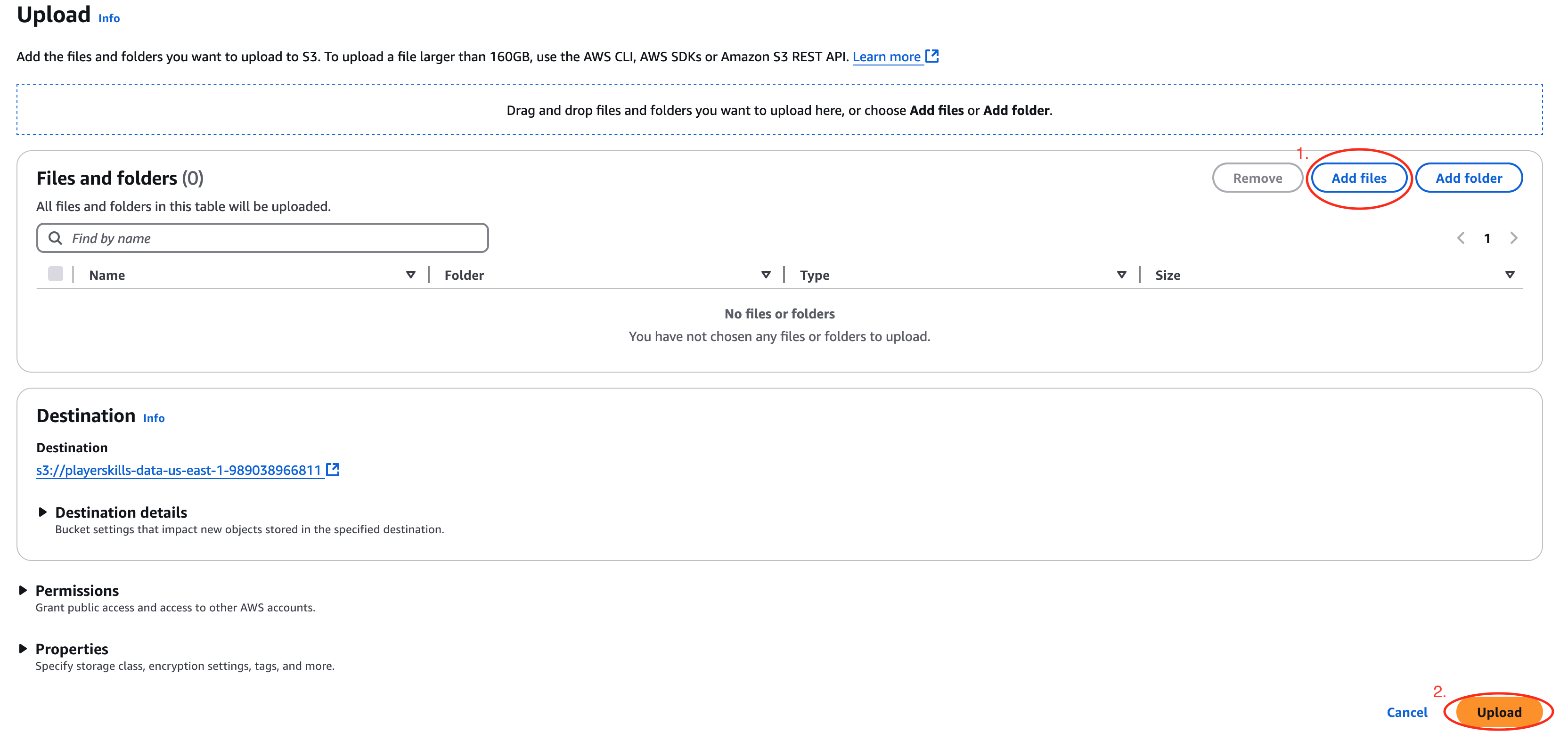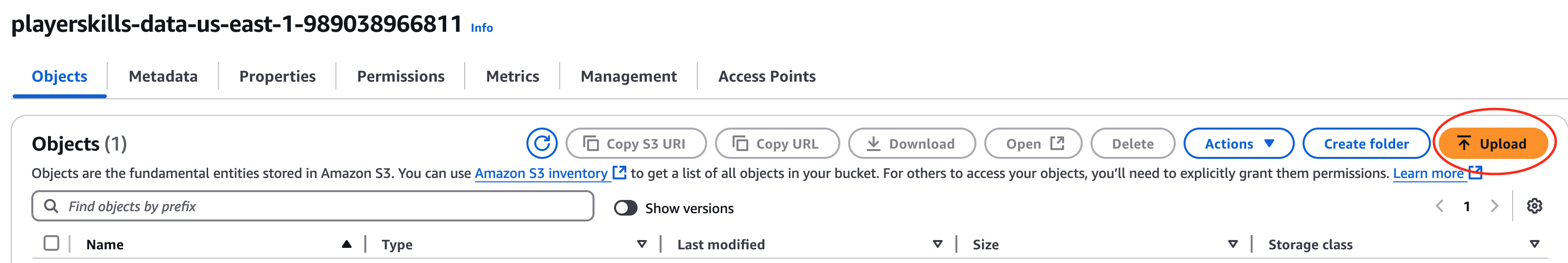 - Open the Amazon S3 console, and choose the bucket that has the name you noted in the previous step. Choose Upload.