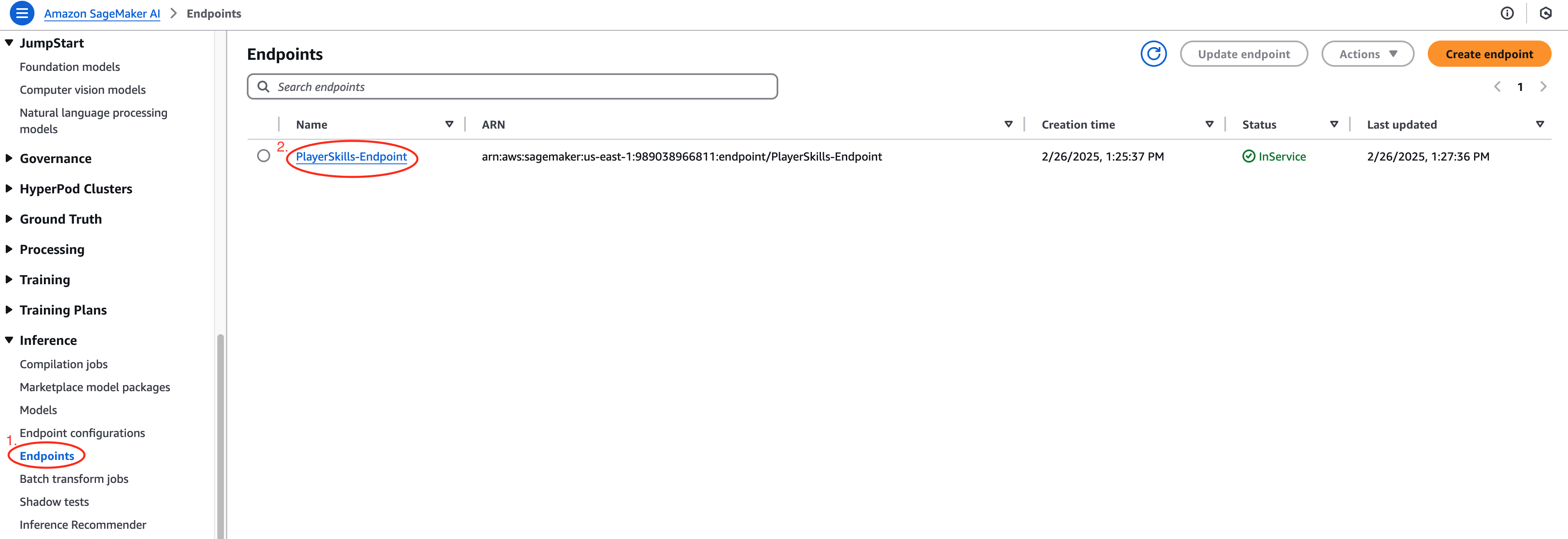 - Once training and model deployment is completed successfully, there is an Amazon SageMaker AI endpoint that will be created. Locate the Amazon SageMaker AI endpoint by navigating to Amazon SageMaker AI in the AWS Management Console. On the left side menu, under the Inference section, choose the Endpoints option. The name of the endpoint in this tutorial is PlayerSkills-Endpoint. Note the name of your created endpoint, you will be referring to this later.