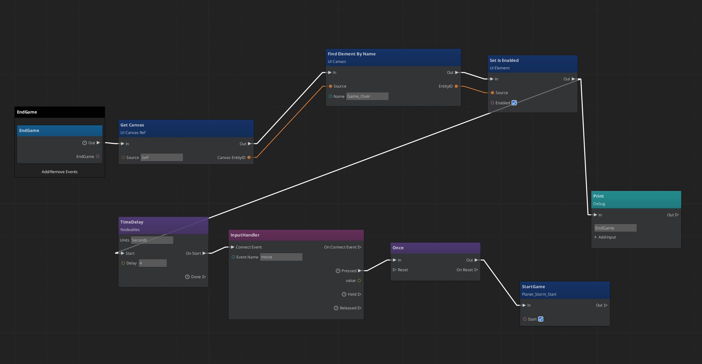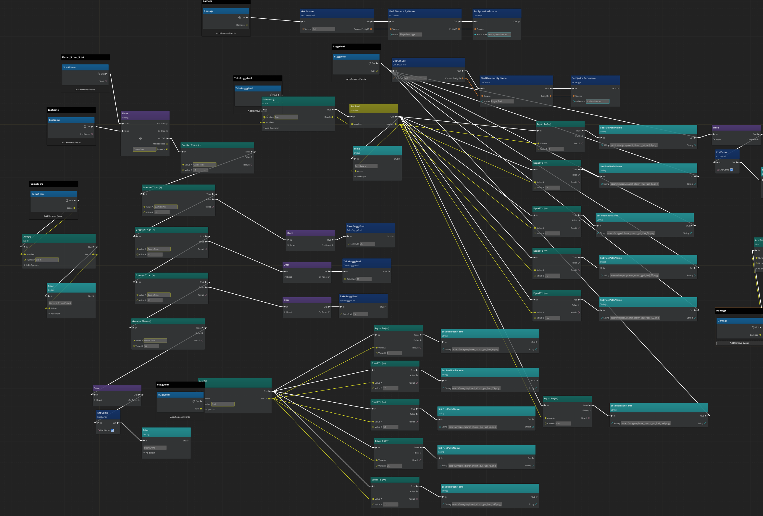 To show you some examples of the logic and how it looks to a developer as it’s being defined, here are some of the Node maps as seen in the Script Canvas Editor: