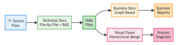 The pipeline shows that technical documentation is generated from source files then converted into YAML files that enable parallel transformation into business reports and process diagrams.