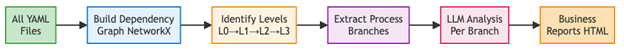 Each process branch fits within context limits ensuring the generated diagrams accurately represent the business logic, decision points, and process flows encoded in the original NCL code. The following diagram depicts the business documentation workflow. Boxes represent pipeline stages, arrows indicate data flow, and the branching structure shows how the dependency graph is segmented into process branches before analysis.