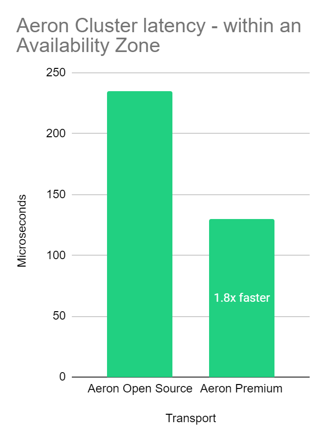 The open-source Aeron Transport is hundreds of times faster than other commonly used open-source messaging protocols. With Aeron Premium, Aeron Transport is, again, twice as fast.