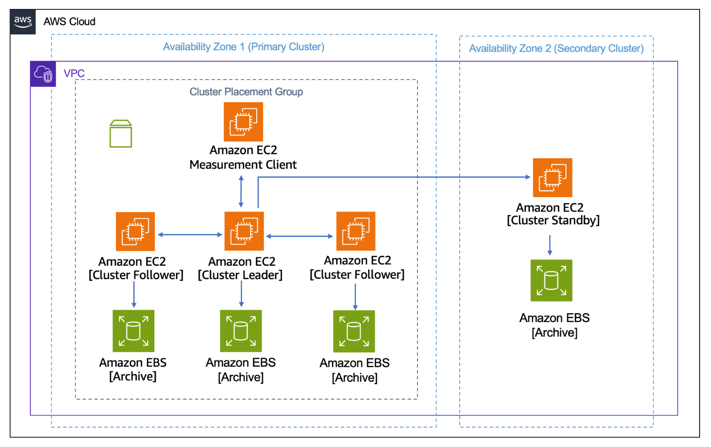 Figure 4: Aeron Cluster test set-up using AWS Cluster Placement Group and Aeron Cluster Standby in a secondary Availability Zone